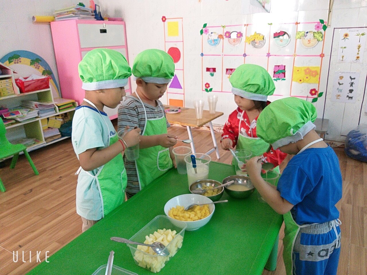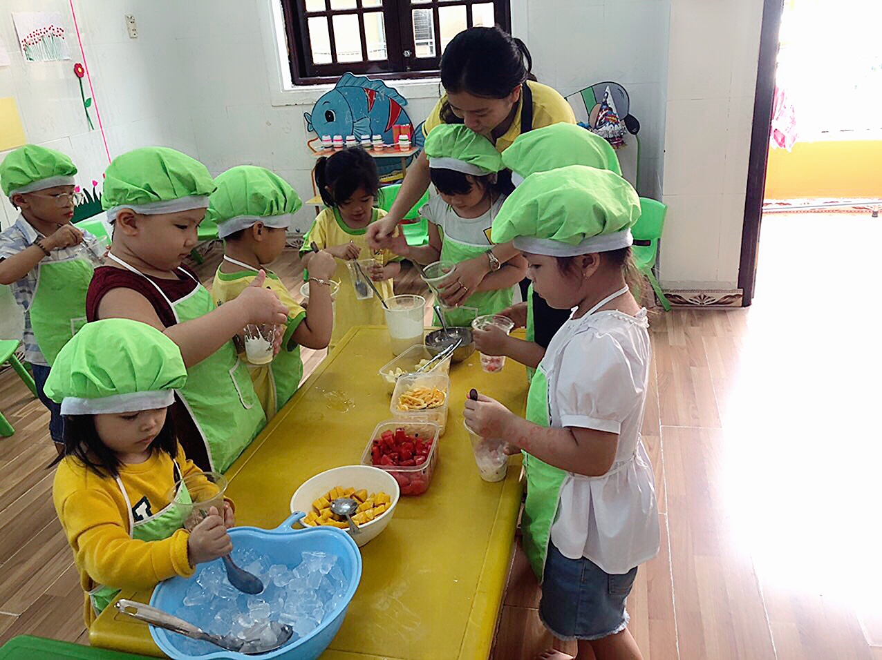Các bé cùng với cô giáo làm sữa chua trái cây. Hương vị rất thơm ngon nha